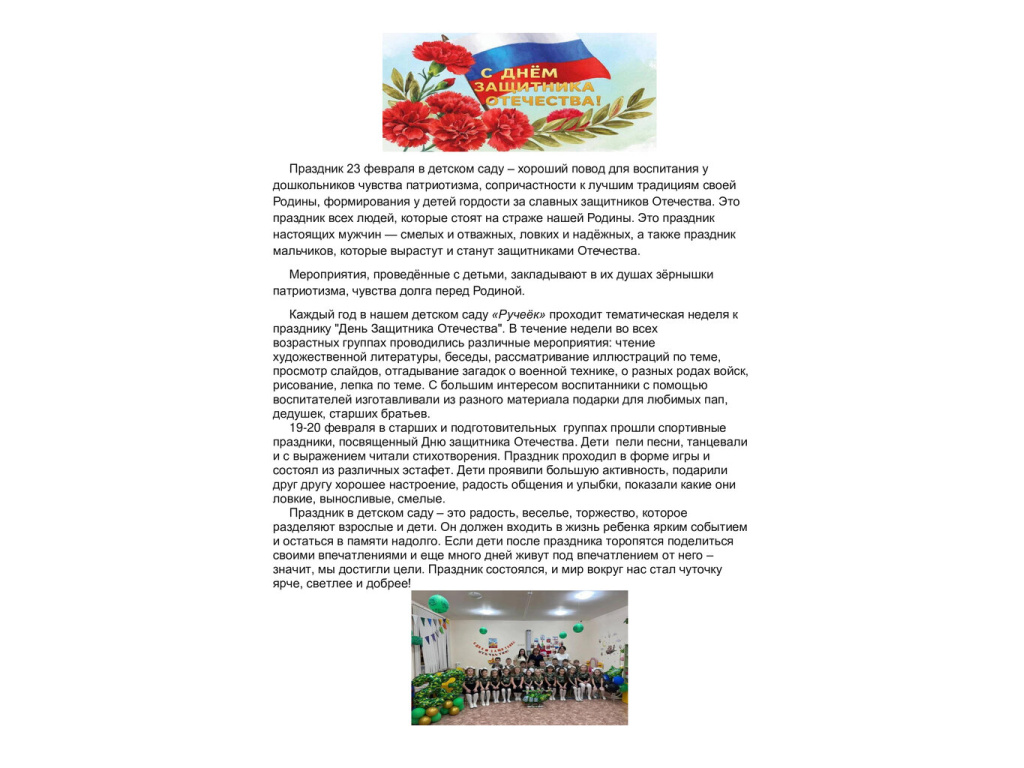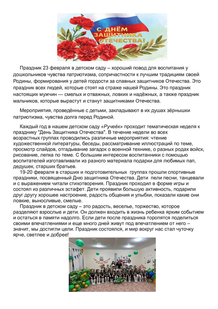 Праздник 23 февраля в детском саду – хороший повод для воспитания у дошкольников чувства патриотизма, сопричастности к лучшим традициям своей Родины, формирования у детей гордости за славных защитников Отечества. Это праздник всех людей, которые стоят на страже нашей Родины. Это праздник настоящих мужчин — смелых и отважных, ловких и надёжных, а также праздник мальчиков, которые вырастут и станут защитниками Отечества.